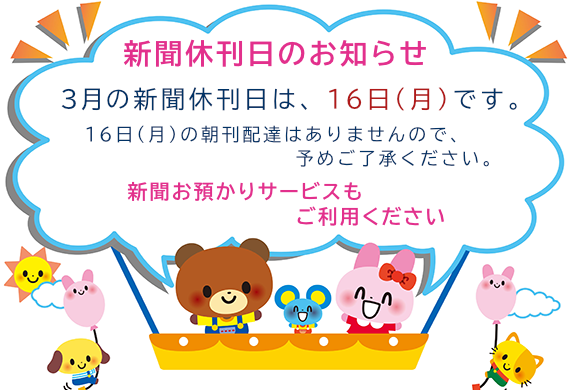 3月の新聞休刊日は、16日(月)です。ご利用ください 新聞お預かりサービス